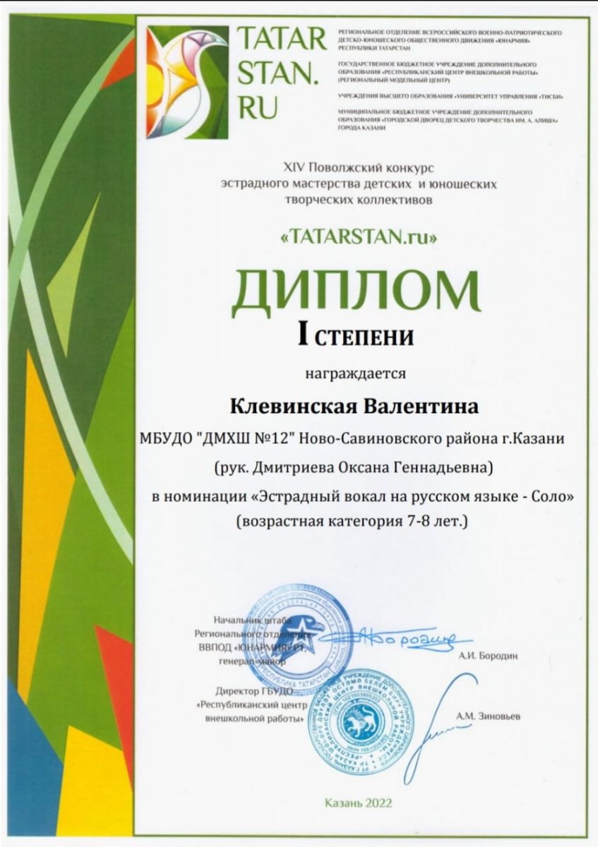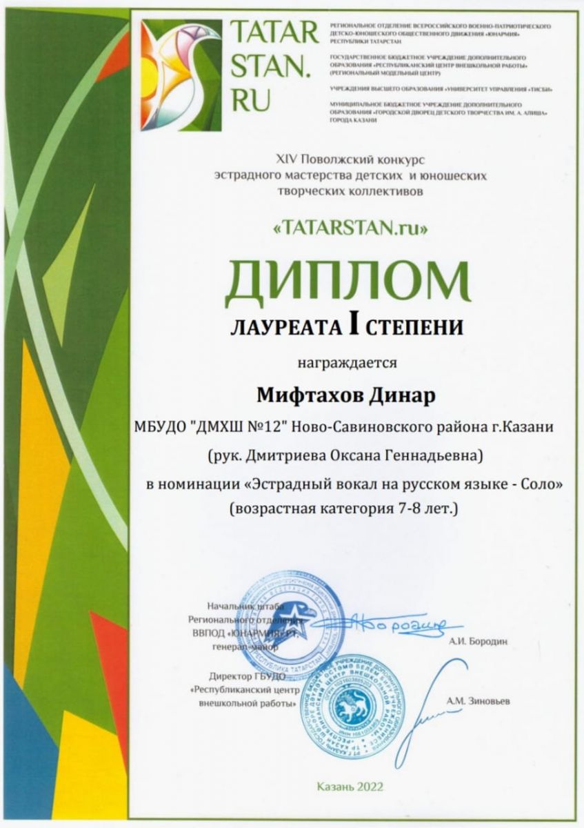 Поздравляем с успешным выступлением учащихся нашей школы на XIV Поволжском конкурсе эстрадного мастерства детских и юношеских творческих коллективов "TATARSTAN.ru":- Мифтахова Динара - Лауреата 1 степени (преподаватель Дмитриева О.Г.)