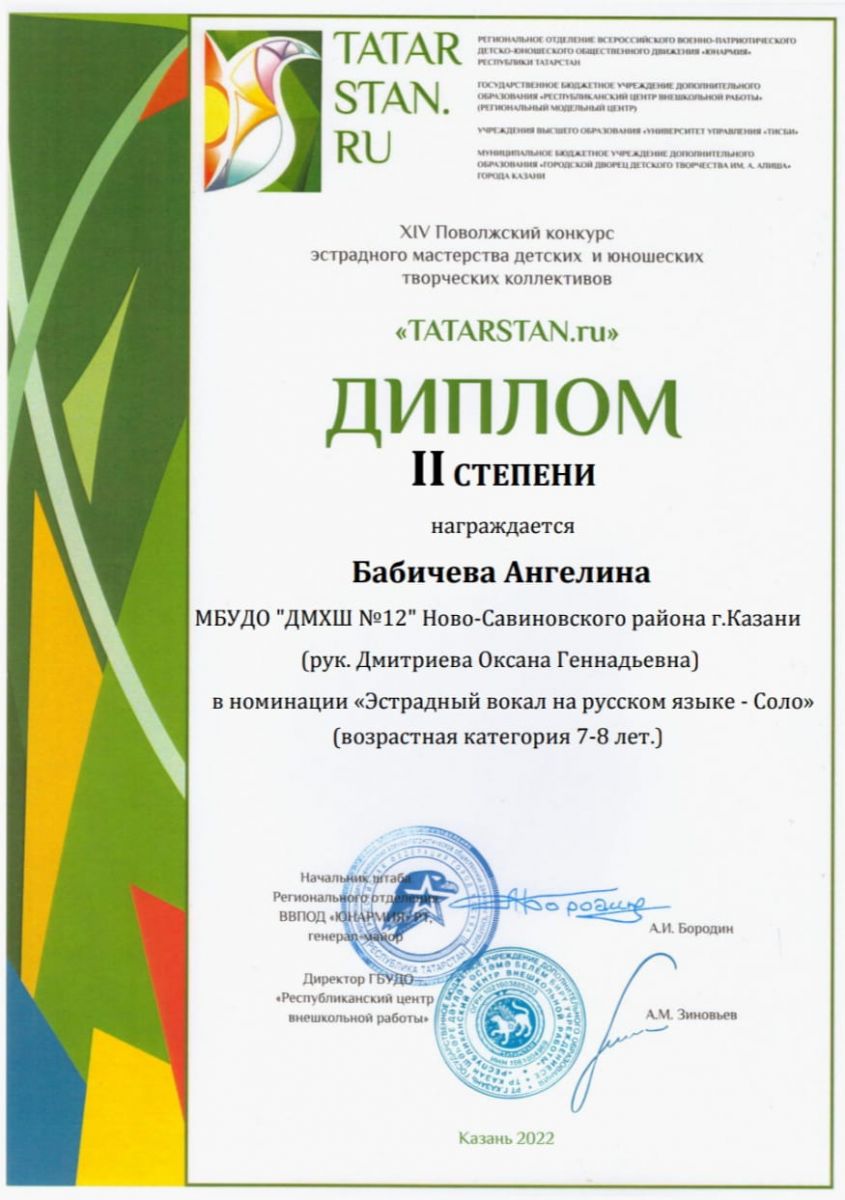- Бабичеву Ангелину - Дипломанта 2 степени (преподаватель Дмитриева О.Г.)