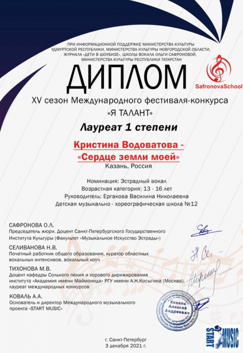 Поздравляем с успешным аыступлением в XV сезоне Международного фестиваль-конкурса "Я ТАЛАНТ":Водоватову Кристину - Лауреата 1 степени (преподаватель Ергакова В.Н.)