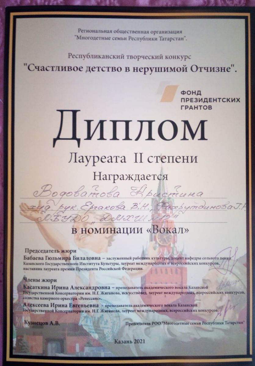 Поздравляем с успешным выступлением на Республиканском творческом конкурсе "Счастливое детство в нерушимой Отчизне" :- Водоватову Кристину - Лауреата 2 степени (преподаватель Ергакова В.Н.)