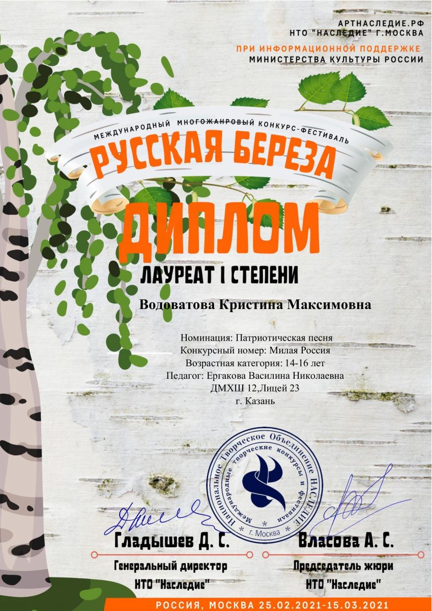 Поздравляем с успешным выступлением на Международном многожанровом конкурсе - фестивале "Русская береза":- Водоватову Кристину - Лауреата 1 степени, номинация: Патриотическая песня (преподаватель Ергакова В.Н.)