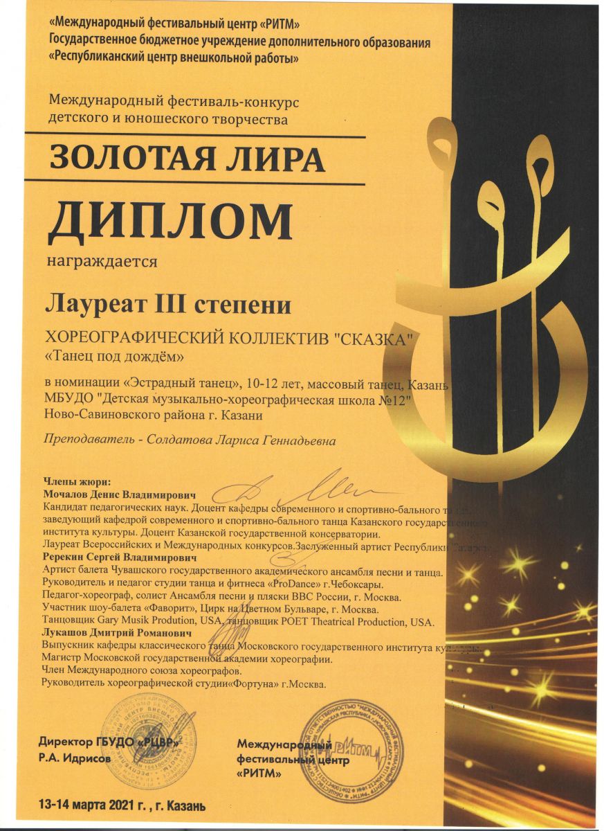 - Хореографический коллектив "Сказка" - Лауреатов 3 степени в номинации эстрадный танец, 10-12 лет (преподаватель солдатова Л.Г.)