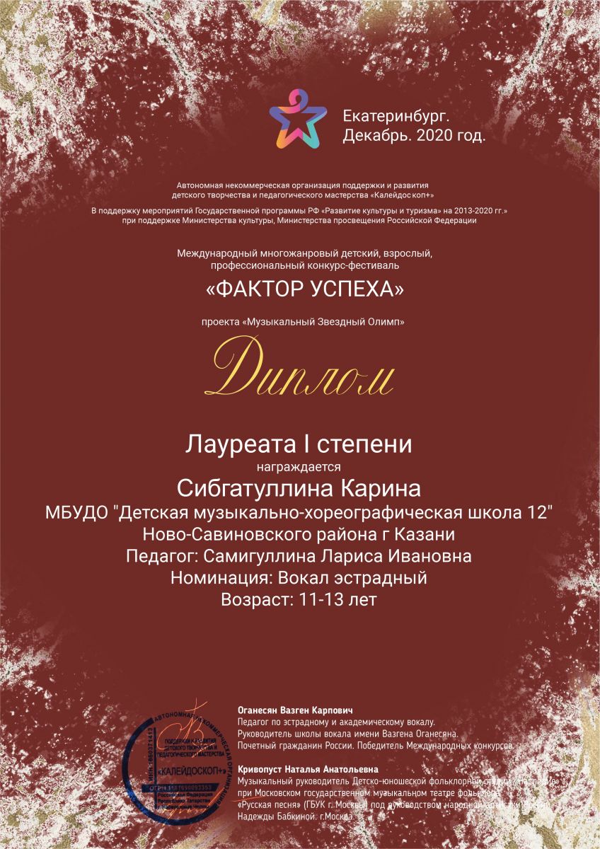 Поздравляем с успешным выступлением на Международном многожанровом детском, взрослом, профессиональном конкурсе-фестивале "Фактор успеха"- Сибгатуллину Карину - Лауреата 1 степени (преподаватель Самигуллина Л.И.). Номинация: Вокал эстрпдный. Возраст: 11-13 лет.