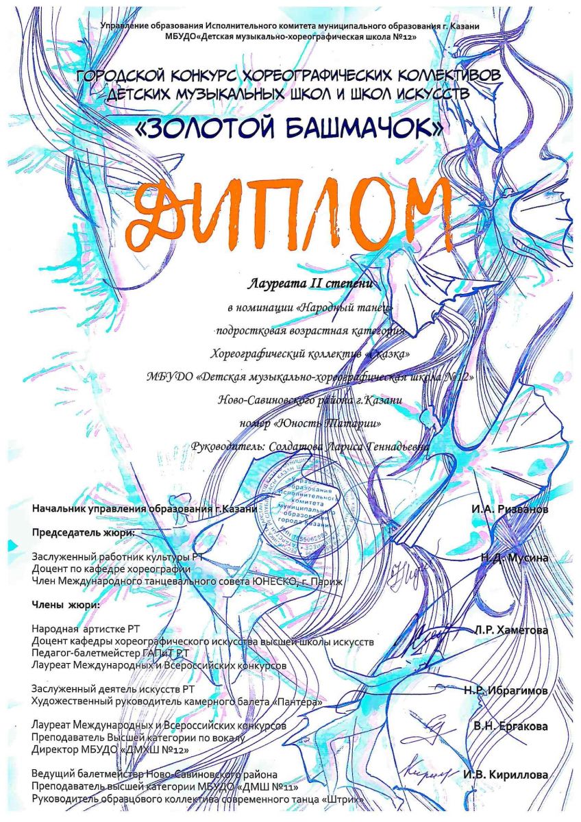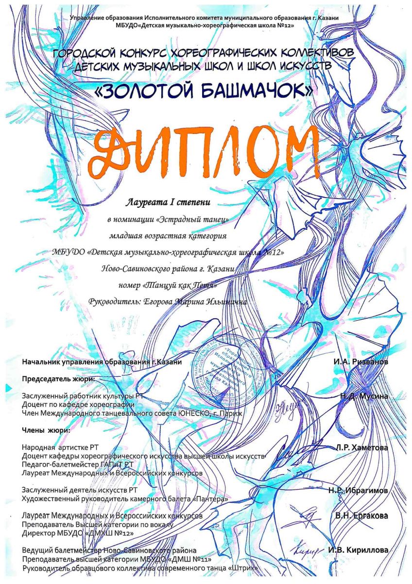 - Самигуллина Марселя и хореографический коллектив "Ласточка"- Лауреатов 1 степени (преподаватели Самигуллина Л.И., Аввакумова Е.Н.)