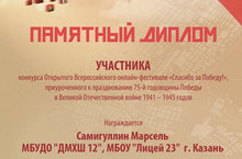 Администрация школы выражает благодарность Самигуллину Марселю за участие в конкусе Открытого Всероссийского онлайн-фестиваля "Спасибо за Победу!"