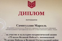 За участие в культурно-патриотической акции "75 песен Великой Победе!", посвященной 75-летию Победы в Великой Отечественной войне ученик школы, Самигуллин Марсель, награжден дипломом Министерства культуры, по делам национальностей и архивного дела Чувашской Республики. Администрация школы выражает благодарность Самигуллину Марселю за активное участие в мероприятиях, посвященных 75-летию Победы.