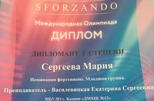 Поздравляем с успешным выступлением на Международной Олимпиаде "SFORZANDO" Сергееву Марию - Дипломанта I степени (преподаватель Василевицкая Е.С.). Желаем дальнейших успехов!