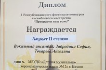 Поздравляем с успешным выступлением на 1 Республиканском фестивале-конкурсе ансамблевого мастерства "Прекрасен наш союз" вокальный ансамбль: Забродину Софию, Токареву Ангелину - Лауреатов 2 степени. (преподаватель Самигуллина Л.И., концертмейстер Ямалеева А.Я.). Желаем дальнейших успехов!