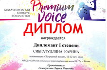 Сибгатуллину Карину - Дипломанта 1 степени Международного конкурса вокалистов "PREMIUM VOICE" . (преподаватель Самигуллина Л.И.). Желаем дальнейших успехов!