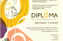 Хореографический коллектив "Сказка" (руководитель Солдатова Л.Г.), дипломантов 1 степени II Международного фестиваль-конкурса детского и юношеского творчества "золотая Лира" . Желаем дальнейших успехов!