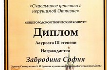 Лауреата 3 степени общегородского творческого конкурса "Счастливое детство в нерушимой Отчизне" -Забродину Софию (преп. Самигуллина Л.И.). Желаем дальнейших успехов!