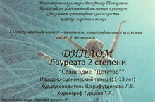 Поздравляем хореографический коллектив "Созвездие "Детство"" (руководитель Шарафутдинова Л.В.) - лауреатов 2 степени I Международного конкурса-фестиваля хореографического искусства им. Н.Д. Юлтыевой "Дорога мечты". Желаем дальнейших успехов!