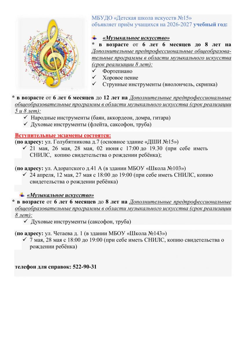 МБУДО «Детская школа искусств № 15» Ново - Савиновского района г. Казани объявляет набор детей в перый класс по направлениям: