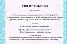 В конце 2024 года в ДШИ №20 состоялась Республиканская научно-практическая конференция "Патриотическое воспитание детей в музыкальном образовании ДМШ и ДШИ на современном этапе: теория и практика". Преподаватель теоретических дисциплин Шамкаева Л.Ф. приняла в ней участие с докладом на тему "Формирование патриотических чувств у обучающихся путем знакомства с творчеством татарского современного композитора Э.Низамова".