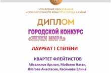 Квартет флейтистов -Абзалилов Арслан, Мойсеев Натан, Лузгова Анастасия и Касимова Элина - стал лауреатом 1 степени городского конкурса "Звуки мира" (преп. Багаева Л.А., конц. Виноградов С.А.)