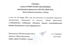 Преподаватель фортепиано Груйич М.М. выступила на заседании Городского методического объединения по предмету "Общее фортепиано" с методическим сообщением "Развитие навыков самостоятельной работы обучающихся в классе фортепиано"