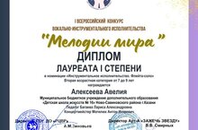 Обучающаяся 3 класса Алексеева Авелия стала лауреатом 1 степени I Всероссийского конкурса вокально-инструментального исполнительства «Мелодии мира». Преподаватель Багаева Л.А., концертмейстер Могилюк А.И. Поздравляем и только вперед, к новым свершениям!