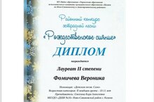 Обучающаяся 4 класса Фомичева Вероника стала лауреатом 2 степени в районном конкурсе эстрадной песни "Рождественское сияние". Преподаватель Ожегина К.А. Поздравляем и желаем дальнейших успехов!