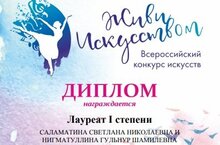 Поздравляем Саламатину Светлану Николаевну и Нигматуллину Гульнур Шамилевну с дипломом лауреата I степени Всероссийского конкурса искусств "Живи искусством" (номинация "Камерный ансамбль", профессионал), а также Шамину Майру с дипломом лауреата I степени (преп. Новоселова Е.М.) Желаем вдохновения и новых побед!