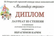 Поздравляем Ибрагимова Карима, лауреата III степени IX Открытого городского конкурса юных исполнителей "Маленькая страна" (преподаватель Асадуллина В.И.) с победой! Желаем дальнейших успехов и свершений!