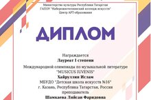 Поздравляем Шамкаеву Л.Ф. и ее ученика Хайруллина Ислама с первым местом на Международной олимпиаде по музыкальной литературе "Musicus iuvenis"! Так держать!