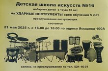 21 мая с 16.00 до 18.00 по адресу Ямашева 100 а состоится набор детей с 10 до 12 лет на отделение ударных инструментов на 2025 - 2026 учебный год
