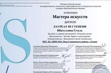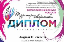 Поздравляем Маннапову Мадину и ее преподавателя Ахметшину Гузель Гильфановну с дипломом лауреата III степени Всероссийского конкурса искусств "Территория творчества", который состоялся в Казани 15 ноября 2023 года. Желаем дальнейших творческих успехов!