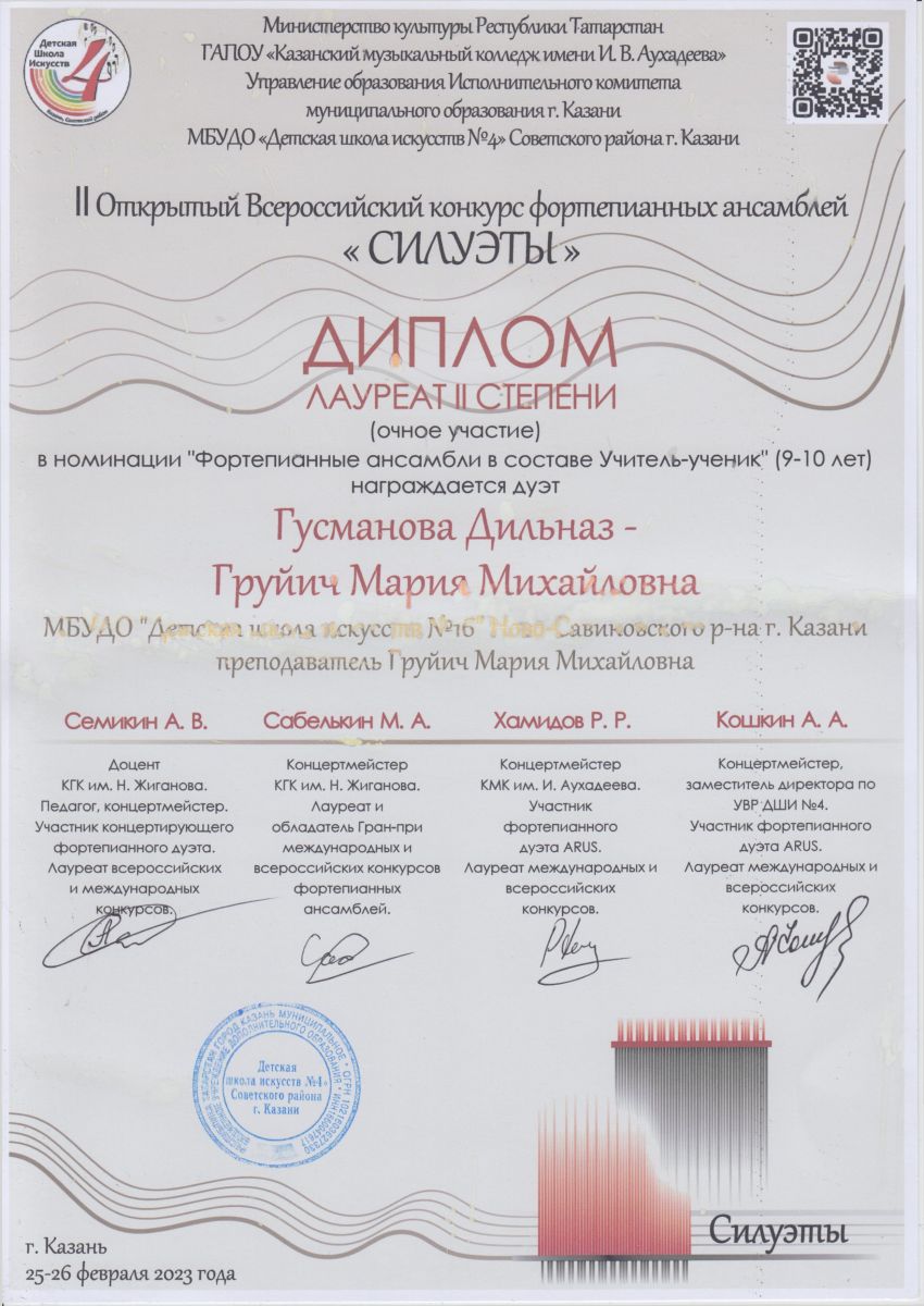 Поздравляем Гусманову Дильназ и Груйич Марию Михайловну- лауреатов 2 степени в номинации "Учитель-ученик" на II Всероссийском конкурсе фортепианных ансамблей "Силуэты", а также ансамбль преподавателей Груйич Марию Михайловну - Митину Анну Анатольевну, лауреатов 3 степени! Желаем дальнейших творческих побед!