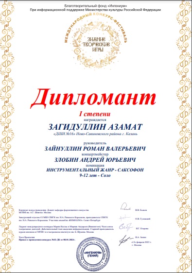 Загидуллин Азамат (преподаватель Зайнуллин Роман Валерьевич) стал дипломантом I степени на международном конкурсе-фестивале "Зимние творческие игры" в номинации " Инструментальный жанр - саксофон".
