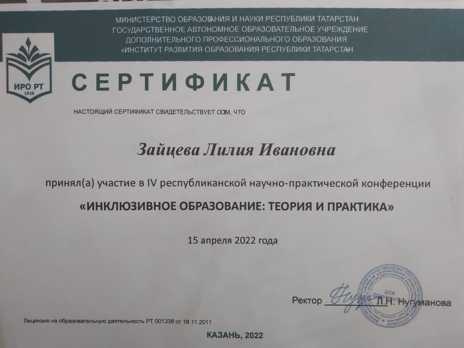 Зайцева Л. И. - сертификат конференции "Инклюзивное образование".jpg