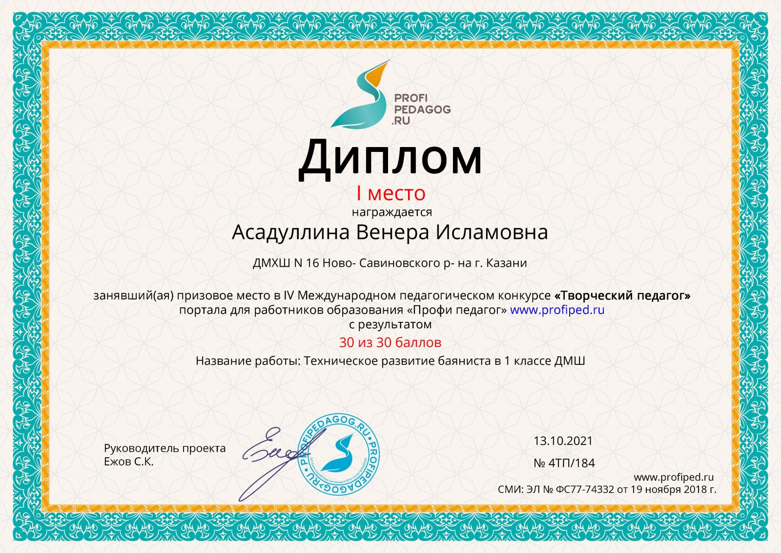 Асадуллина В. И. - Диплом I место конкурса "Творческий педагог.jpg