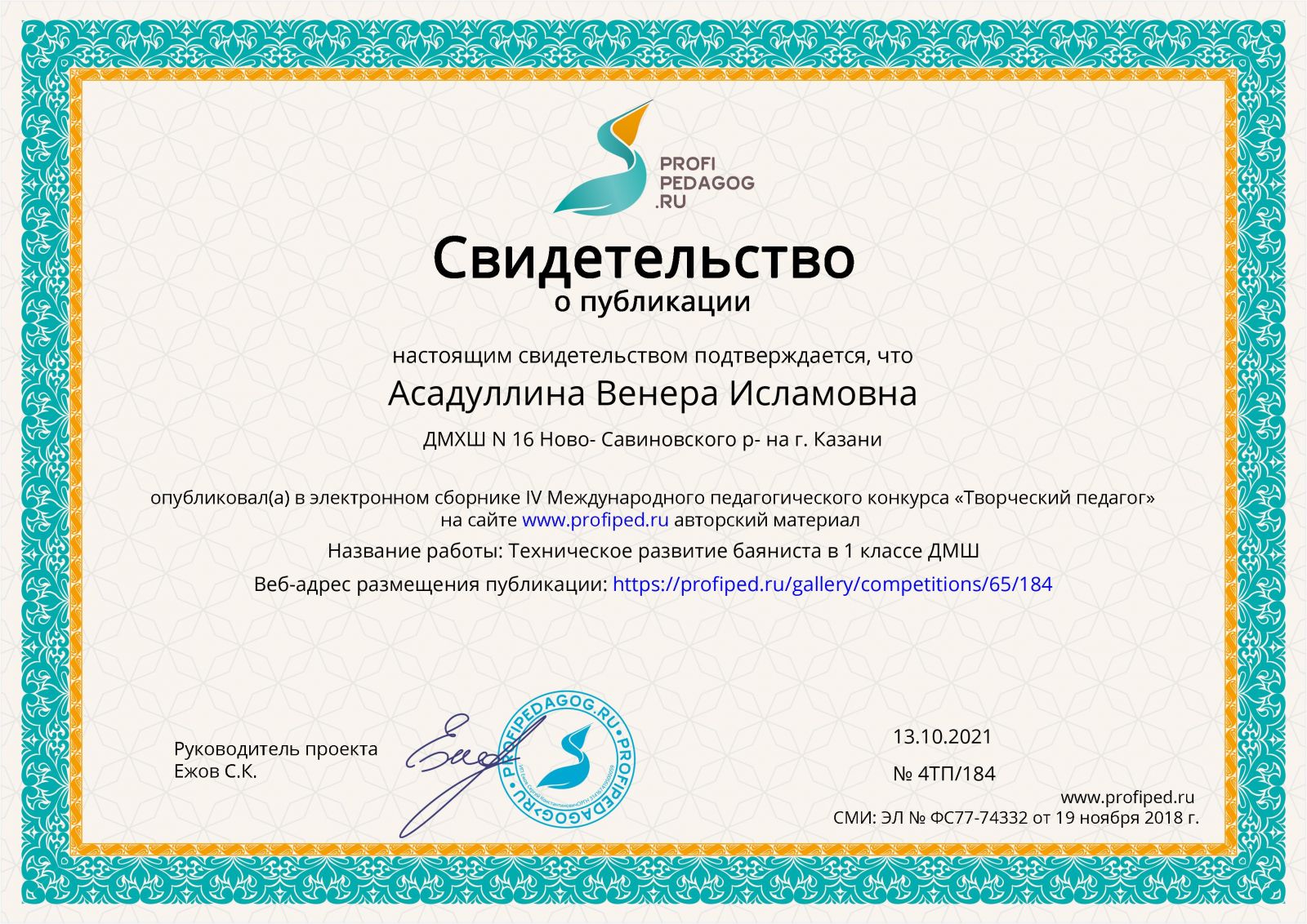 Асадуллина В. И. - Свидетельство о публикации конкурса "Творческий педагог.jpg