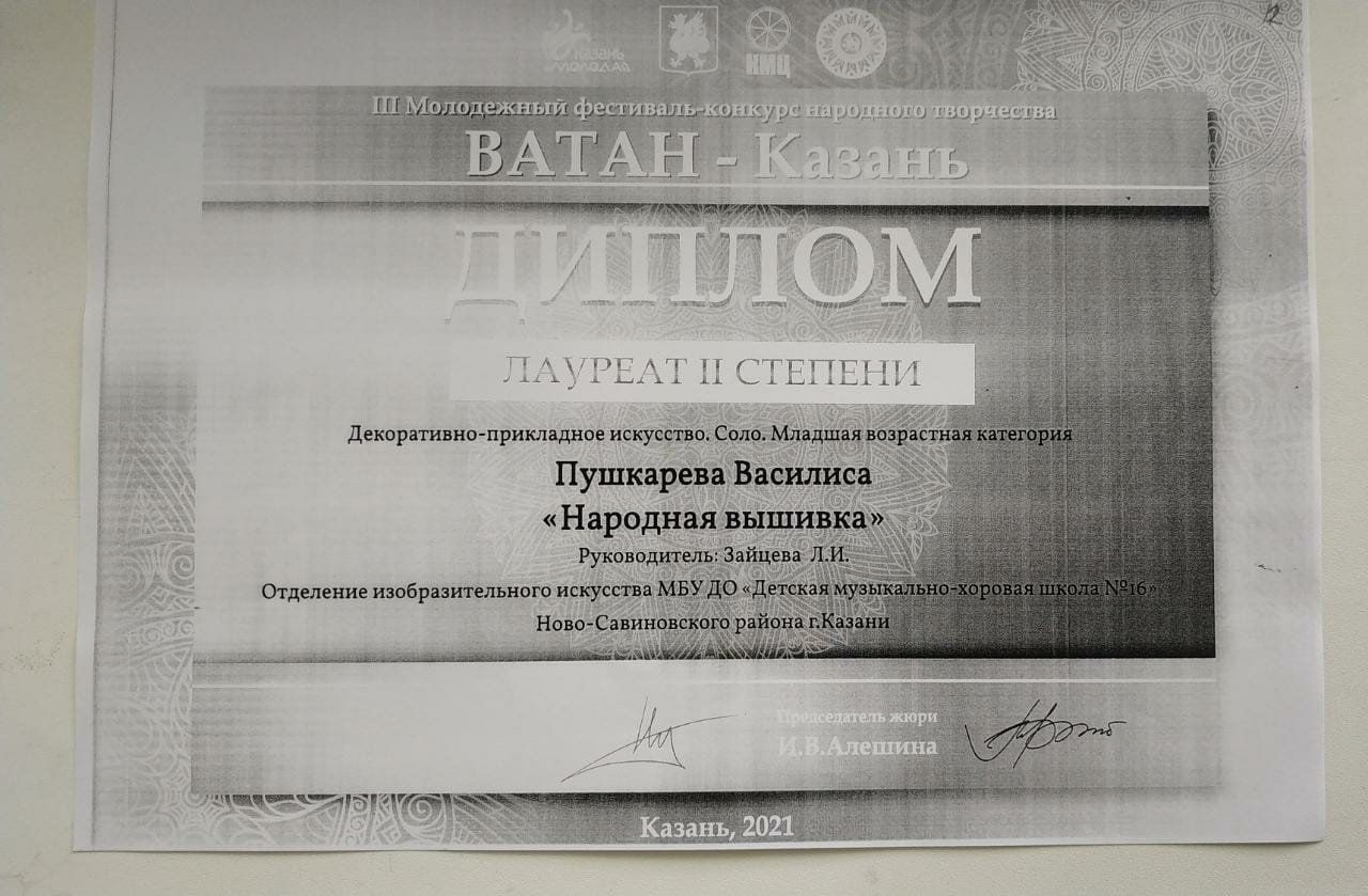 Пушкарева В.- Лауреат II степени конкурса "Ватан-Казань".jpg