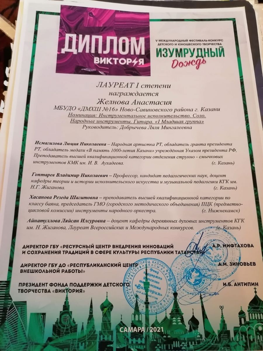 Желнова А. - Лауреат I степени конкурса "Изумрудный дождь".jpg