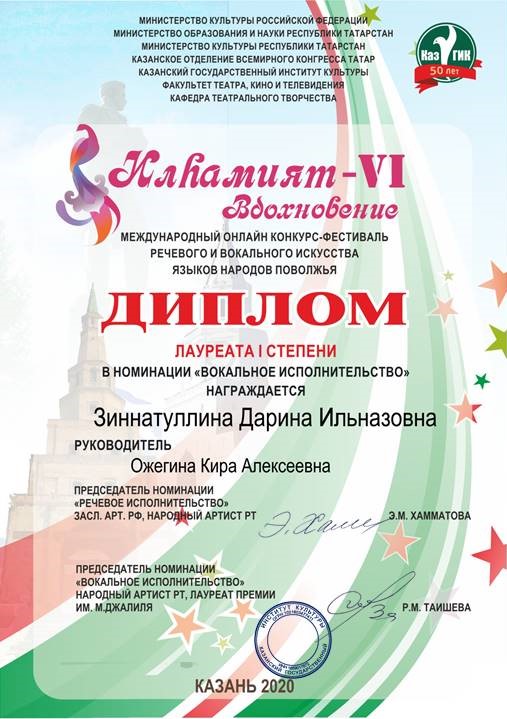 5. Зиннатуллина Д. - Лауреат I степени конкурса "Илhамият-VI Вдохновение".jpg