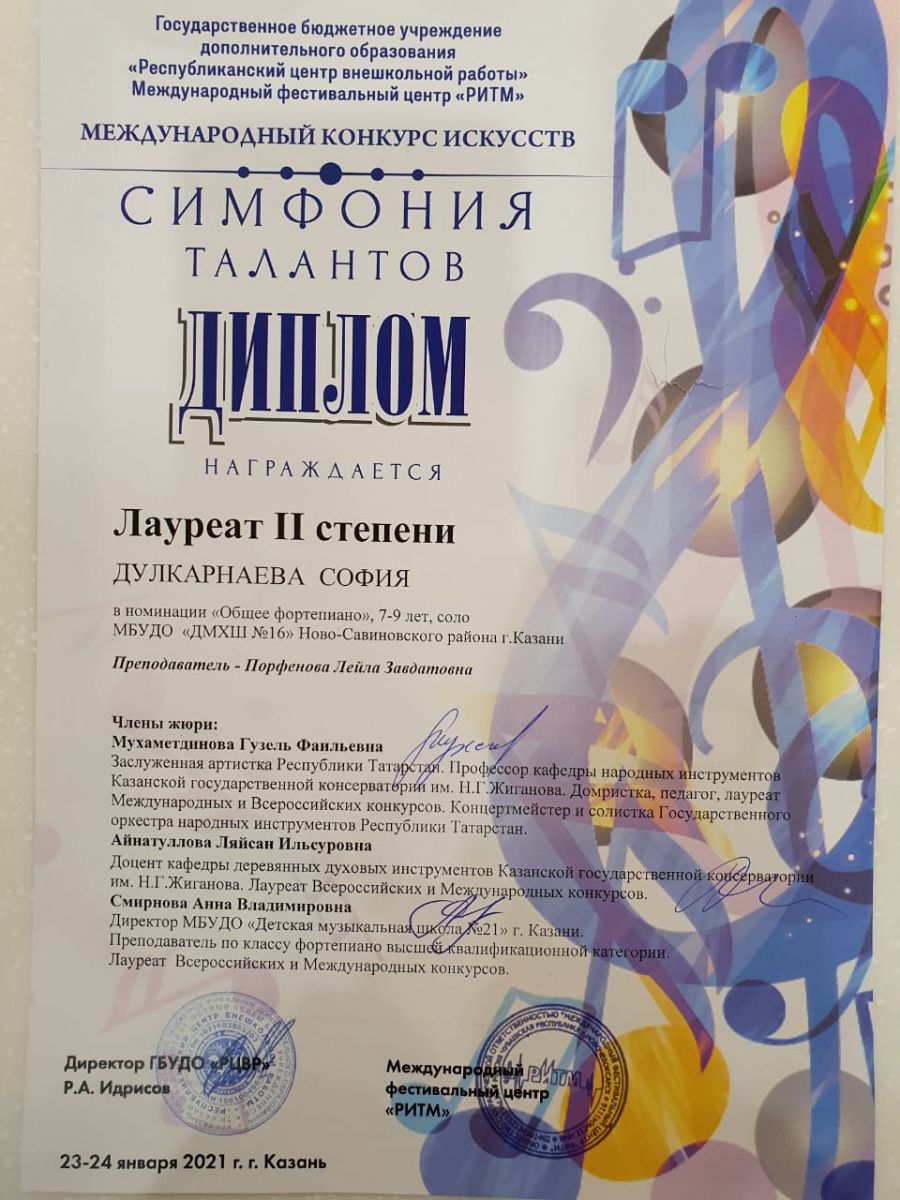 9. Дулкарнаева София - Лауреат II степени конкурса "Симфония талантов".jpg