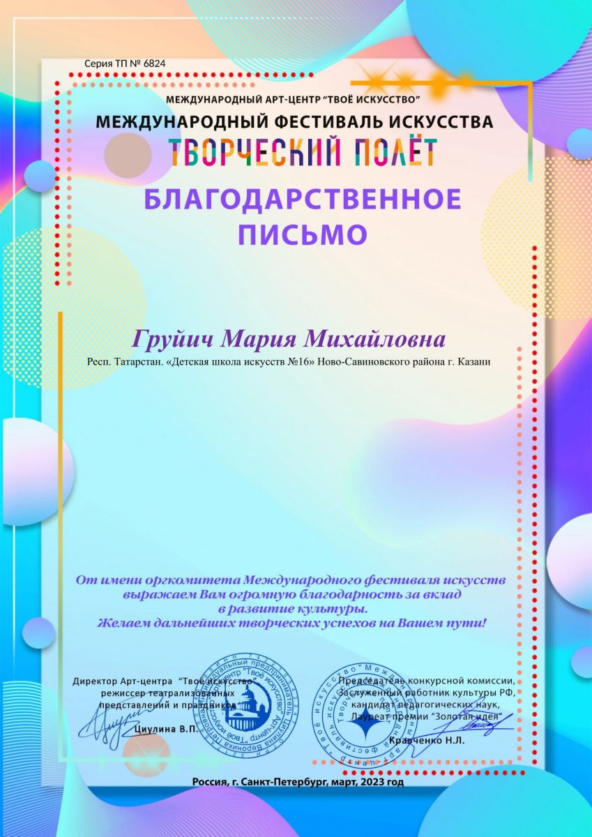 Груйич М.М. - Благодарственное письмо "Творческий полет"