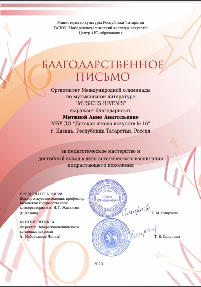 Митина Анна - благодарственное письмо Олимпиада по муз литературе "Musicus Iuvenis"