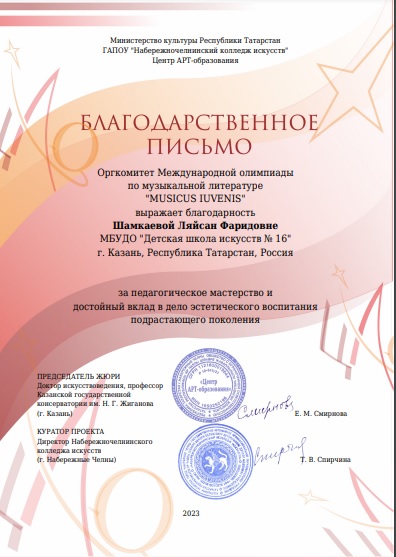 Шамкаева Л.Ф - благодарственное письмо Олимпиада по муз. литературе " Musicus Iuvenis".jpg