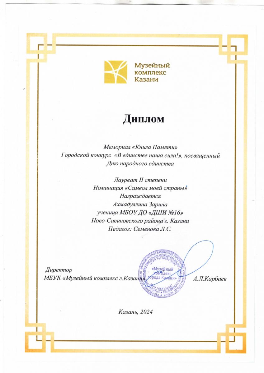 6. Ахмадуллина Зарина городской конкурс «В единстве наша сила!» - лауреат 2 степени