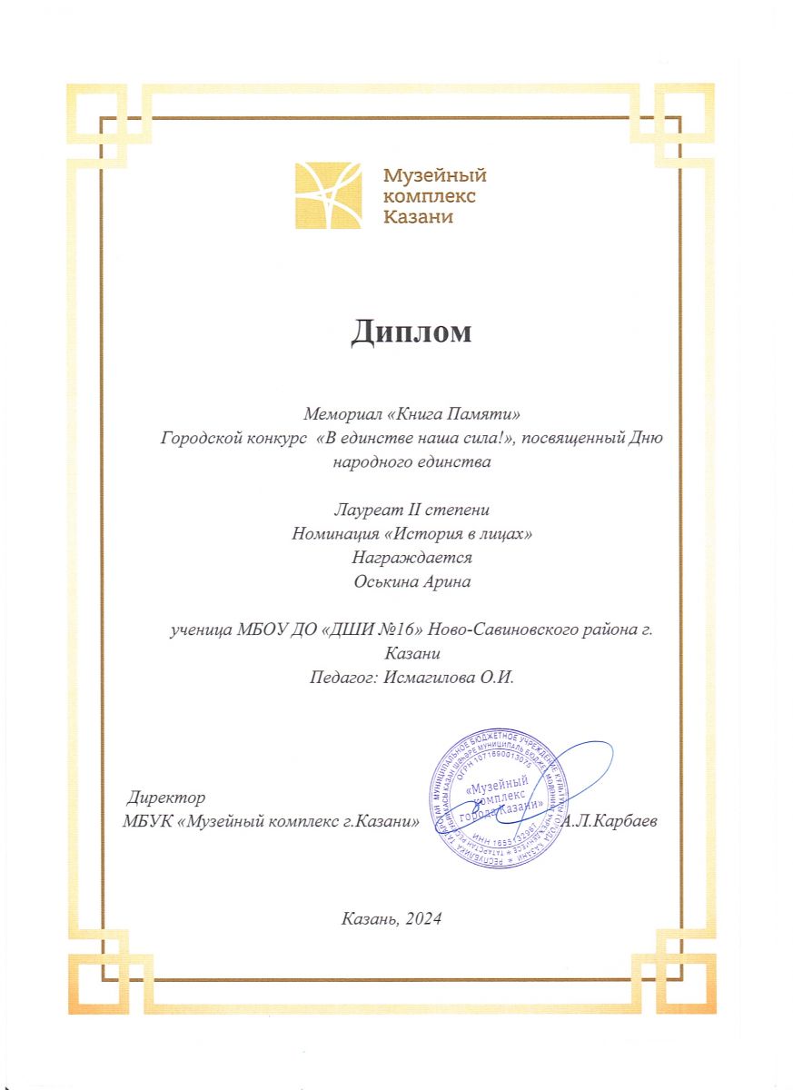 4. Оськина Арина городской конкурс «В единстве наша сила!» - лауреат 2 степени