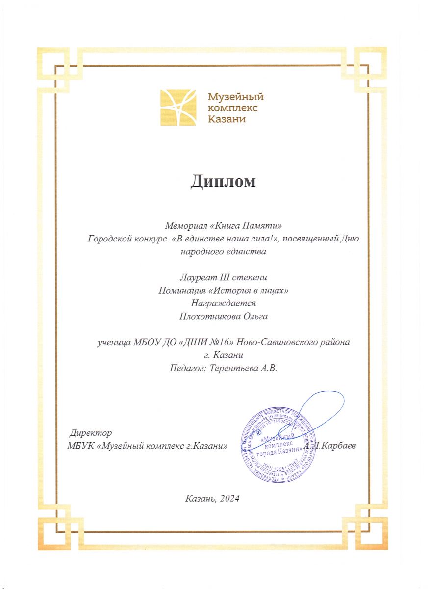 2. Плохотникова Ольга городской конкурс «В единстве наша сила!» - лауреат 3 степени