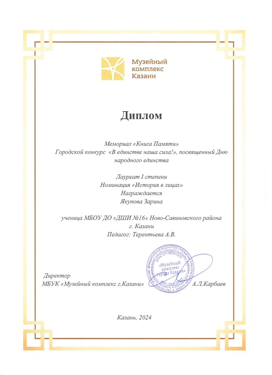3. Якупова Зарина городской конкурс «В единстве наша сила!» - лауреат 1 степени