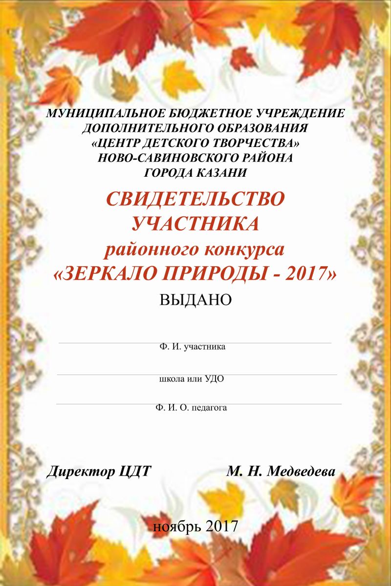 Все участники конкурса «Зеркало природы» , не занявшие призовые места, получают «Свидетельство участника» от Центра детского творчества. «Свидетельства участника» . школы распечатывают самостоятельно (образец прилагается), печать и подпись директора – в ЦДТ. .