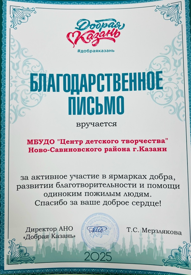 Опубликовано: 28.10.2025Нашему Центру вручили благодарственное письмо от благотворительной организации «Добрая Казань» за активное участие в ярмарках добра, развитии благотворительности и помощи одиноким пожилым людям. Творим добро вместе!