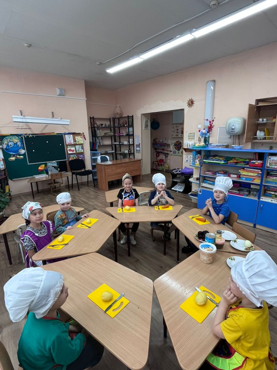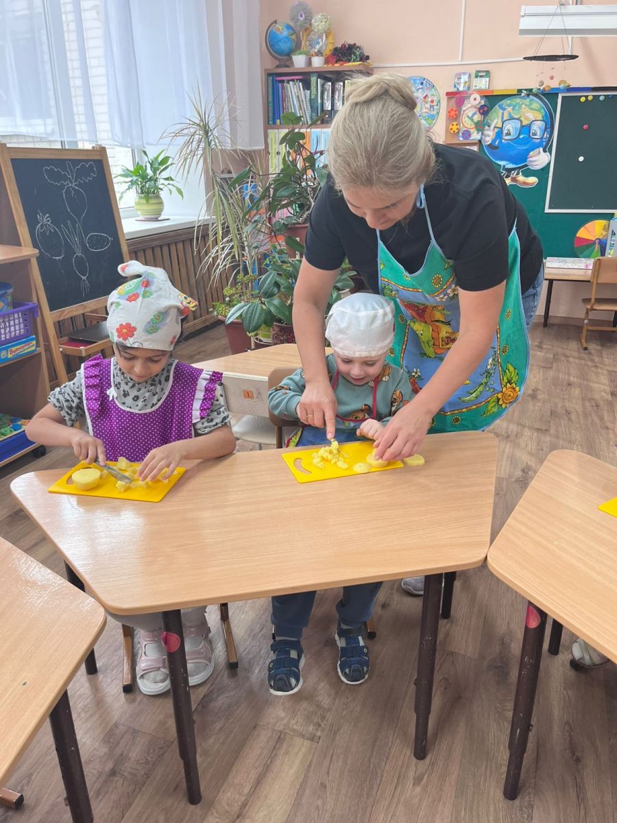 Перед приготовлением дети отгадывали загадки об овощах, выясняли, какие витамины в них находятся и какую приносят пользу, повторяли правила безопасности. Затем, вооружённые знаниями, разделочными досточками и ножиками, надев фартуки и головные уборы, ребята приступили к приготовлению винегрета.