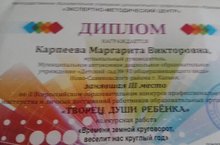 Музыкальный руководитель нашего детского сада Карпеева Маргарита Викторовна заняла III место во II Всероссийском образовательном конкурсе профессионального мастерства и личных достижений работников образовательных организаций "Творец души ребёнка". Поздравляем Маргариту Викторовну с победой!