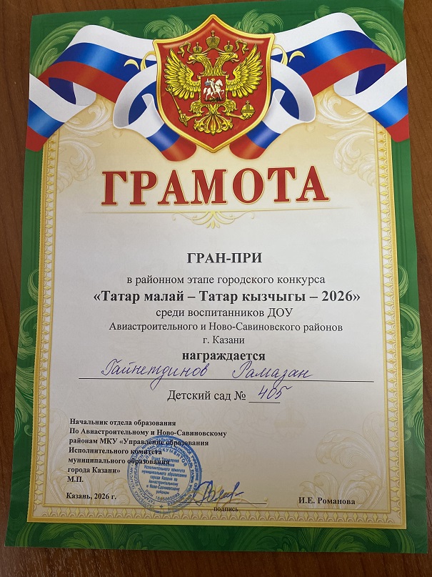 Район куләмендә оештырылган " Татар малае һәм татар кызчыгы" конкурсында мәктәпкә әзерлек төркеме тәрбияләнүчесе Гайнетдинов Рамазан Гран При дәрәҗәсенә лаек булды. Без аны бу уңышы белән котлыйбыз һәм яңадан -яңа унышлар теләп калабыз!