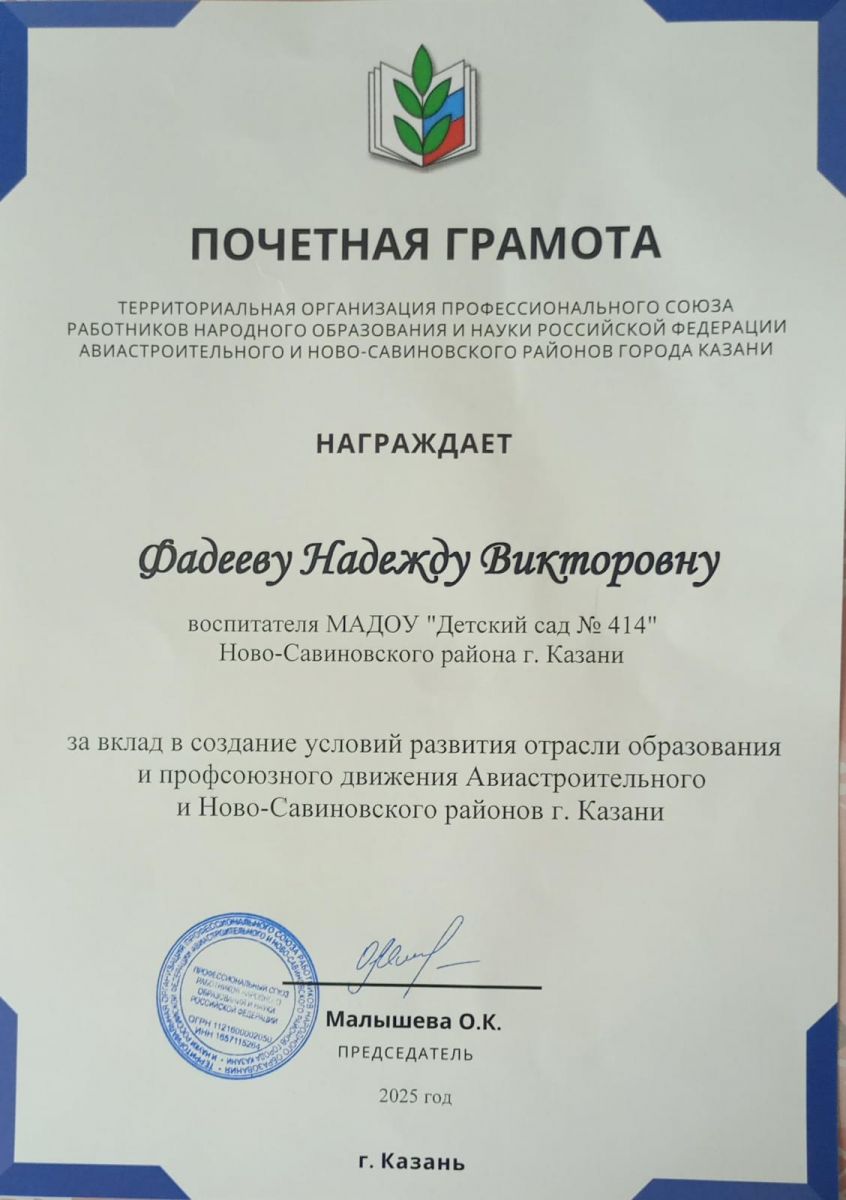 Коллектив нашего дошкольного учреждения поздравляет воспитателя Фадееву Надежду Викторовну, которой вручили Почетную грамоту за вклад в создание условий развития отрасли образования и профсоюзного движения Авиастроительного и Ново-Савиновского районов г.Казани.