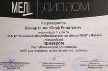 На Республиканской олимпиаде МЕЛ (математика естествознание, логика) очередную победу завоевал ученик 5 Б класса Шакирзянов Юсуф.Олимпиада проходила в 2 этапа. Со 2 по 17 мая 2016 года состоялся заочный интернет- тур. Лушие 22 мая были приглашены на очный тур. Юсуф достойно представил нашу школу и завоевал призовое место. Молодец! Мы очень гордимся тобой!
